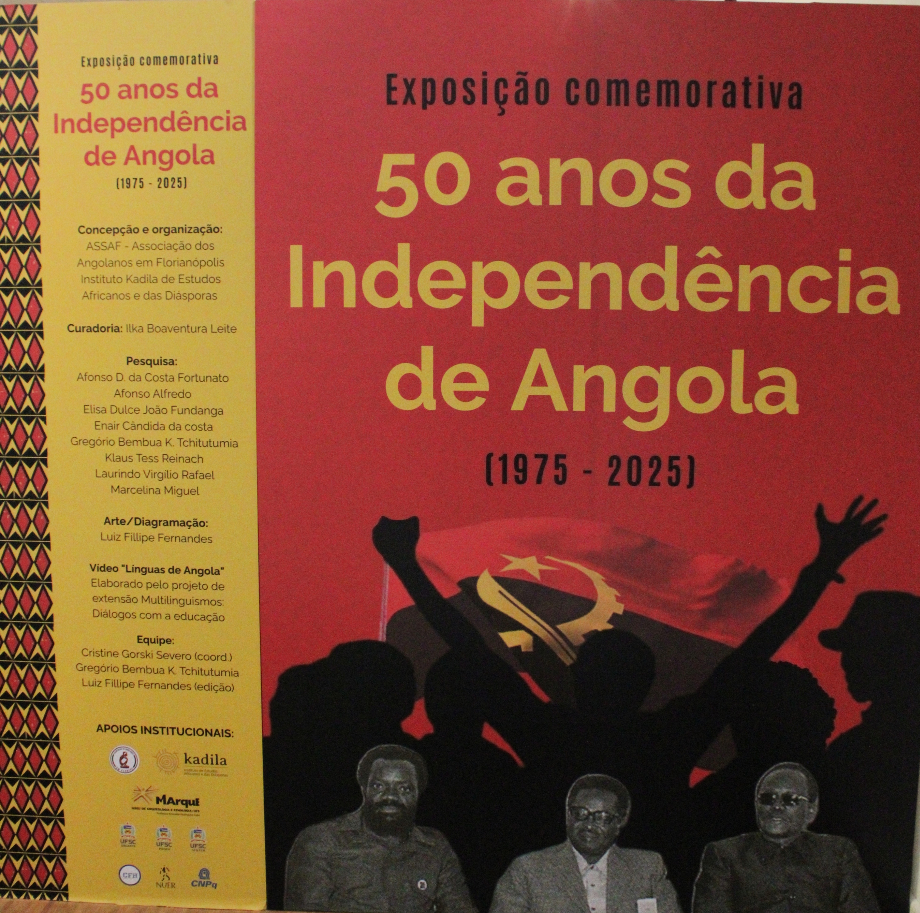 A exposição reforça o pertencimento da comunidade angolana em Florianópolis e celebra os 50 anos de independência, apresentando momentos marcantes da história de Angola — da guerra colonial à independência em 1975 — e aspectos da sociedade contemporânea, como geografia, cultura, línguas, educação, literatura, música e culinária. Também inclui registros de viagens dos professores Ilka Boaventura Leite e Nazareno José de Campos ao Deserto de Namibe, realizados durante o Projeto Kadila (2012-2018). São apresentadas fotografias, mapas, livros, esculturas, artes têxteis e artefatos diversos, além do vídeo “Línguas de Angola”, produzido pelo projeto “Multilinguismos: diálogos com a Educação” (CNPq), coordenado pela Profª Cristine Gorski Severo, com edição de Gregório Tchitutumia e Luiz Fillipe Fernandes.