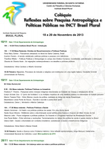 Pesquisadores do Instituto Brasil Plural reúnem-se em Florianópolis, de 18 a 20 de novembro, para o colóquio Reflexões sobre Pesquisa Antropológica e Políticas Públicas no INCT Brasil Plural, em que vão apresentar e debater os trabalhos realizados nas redes do IBP. A maioria deles tem mostrado um constante tensionamento entre as práticas culturais e as políticas públicas em diversos segmentos sociais, como a questão indígena, saúde, migrações, direitos humanos e o reconhecimento de saberes locais, que serão tema de quatro mesas redondas. Na programação também está a exibição de dois documentários e duas palestras (veja a programação completa).