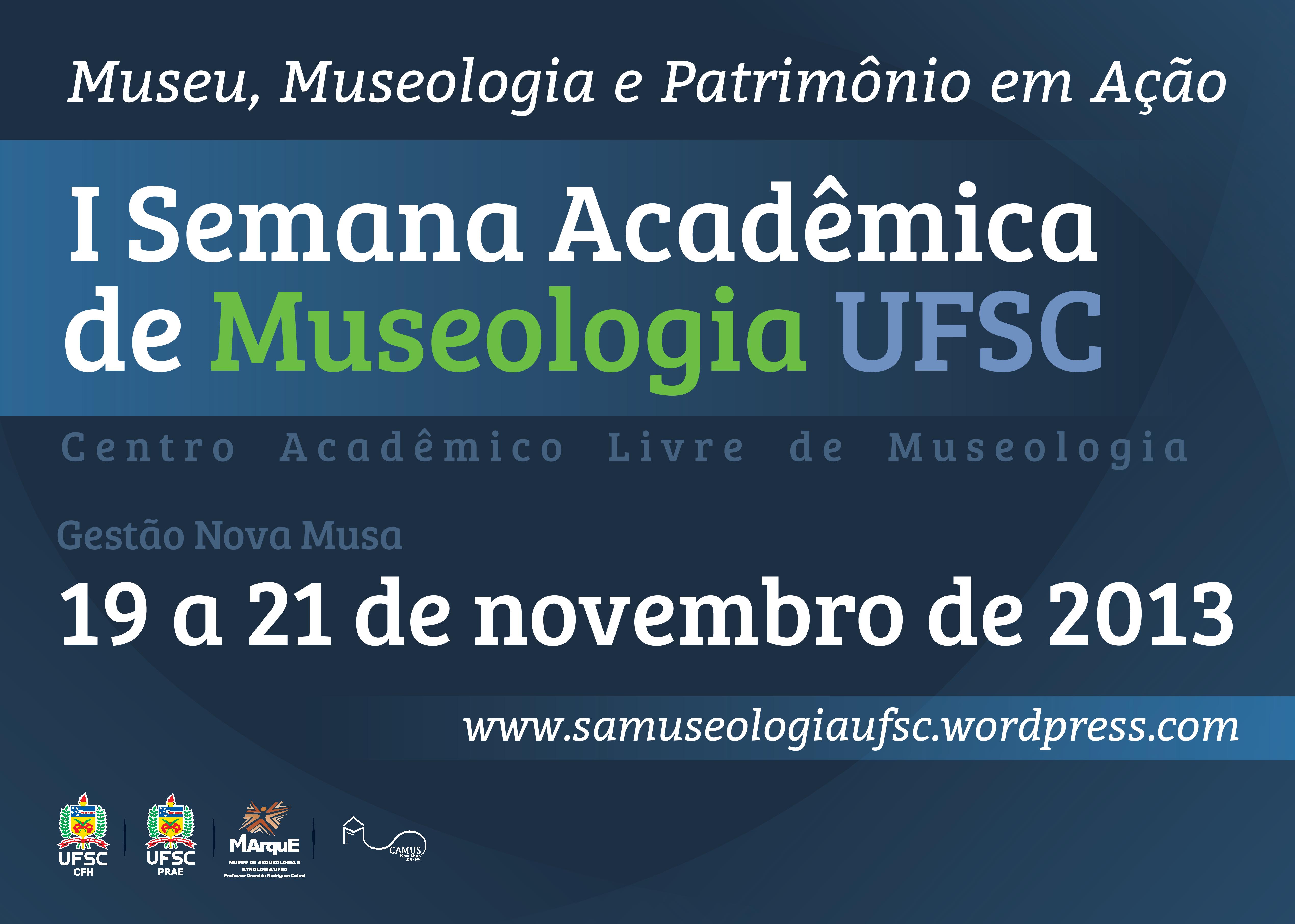 A I Semana Acadêmica de Museologia da UFSC: Museu, Museologia e Patrimônio em Ação, promovida pelo Centro Acadêmico Livre de Museologia, ocorrerá nos dias 19, 20 e 21 de novembro no Centro de Filosofia e Ciências Humanas.