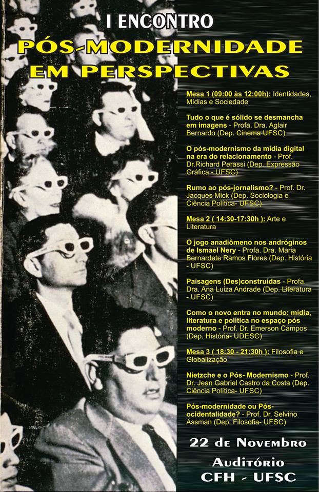 O Encontro “Pós-modernidade em perspectiva” será realizado no dia 22 de novembro, no auditório do CFH, e contará com pesquisadores da UFSC de várias áreas.