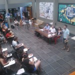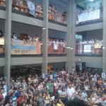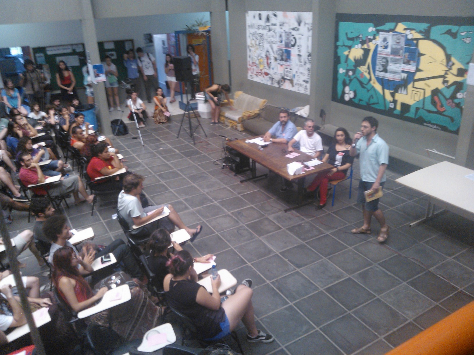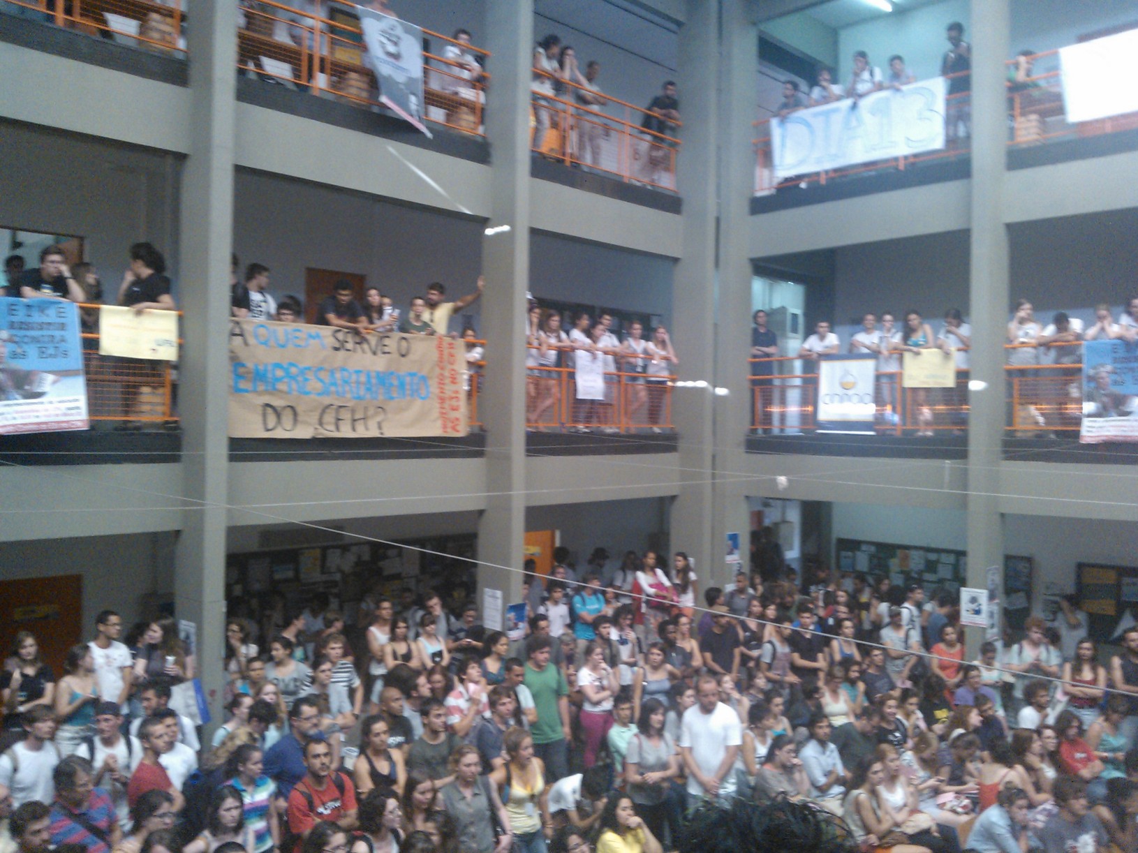 Com 553 pessoas credenciadas, entre estudantes técnicos/as e professores/as, e o saguão e galerias do prédio de salas de aula totalmente lotados, a assembleia geral que reuniu nesta quarta, 13 de novembro, a comunidade do Centro de Filosofia e Ciências Humanas da UFSC, deliberou, por 329 votos a 160, por não autorizar a criação de empresas juniores no Centro. O voto majoritário foi: “O entendimento desta assembleia geral do CFH é de que as empresas juniores não são coerentes pedagogicamente com o papel da universidade pública. Portanto, a posição desta assembleia é de que não se credencie/autorize a criação de empresas juniores neste centro.”